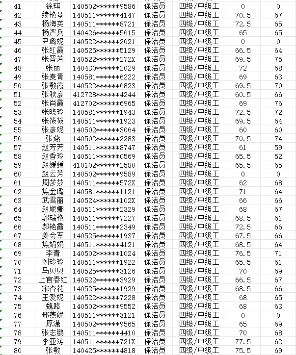 晉城市潔霸清潔服務(wù)股份有限公司職業(yè)技能等級認(rèn)定中心現(xiàn)將2024年2月4日認(rèn)定人員成績公示如下: