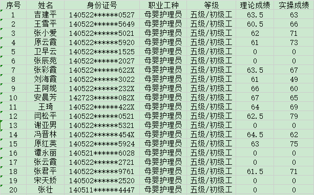 晉城市潔霸清潔服務(wù)股份有限公司職業(yè)技能等級認定中心2024年10月14日第41批家政服務(wù)員(母嬰護理員)初級認定人員成績公示